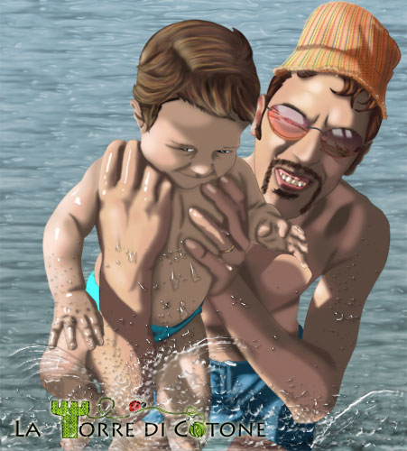 L’immagine è interamente ridisegnata a mano su Photoshop, partendo da una foto scattata da me. I soggetti sono mio marito e la mia primogenita nel suo primo bagnetto al mare, all’epoca aveva circa 8 mesi. E’ stato un momento stupendo per noi così ho voluto imprimere nella memoria la scena, regalando questo poster a mio marito il giorno del suo compleanno. Lasciamo stare il fatto che il poster sia rimasto sempre e solo un’immagine sul PC andando ad accatastarsi nella miriade di progetti mai portati a compimento, d’altra parte basta il pensiero, no?