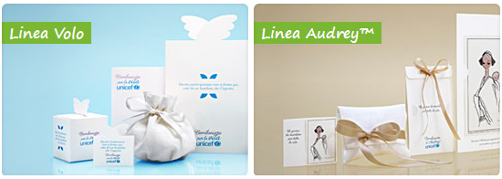 Non poteva di certo mancare l’UNICEF, che con le sue bomboniere della linea acquista vaccini per i bambini e, con la linea Audrey, pensa invece al cibo per i più bisognosi. |